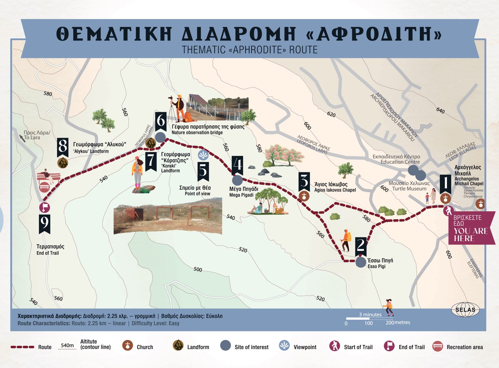 Τη διαδρομή «Αφροδίτη» μπορεί να διανύσει ο περιηγητής, ακολουθώντας ένα ήπιο δρόμο είτε με αυτοκίνητο ή καλύτερα οδοιπορώντας.